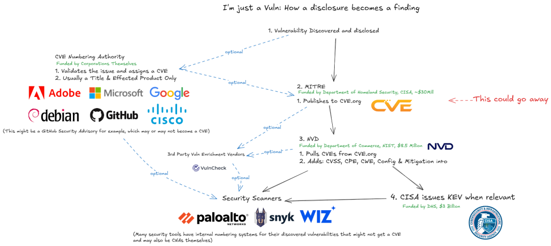 值得注意的是,图中标注”This could go away”(这可能会消失)指向MITRE,这一标注值得关注。如果MITRE的角色发生变化,整个CVE生态系统可能需要重新调整,这反映了MITRE在系统中的重要性。