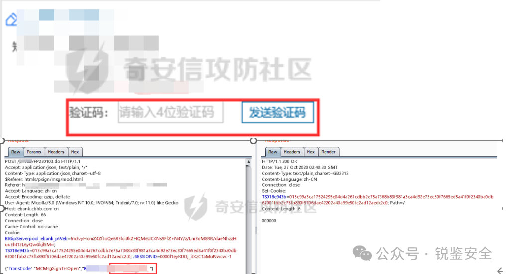 在抓取短信验证码的数据包后,在 response 可以看到短信验证码