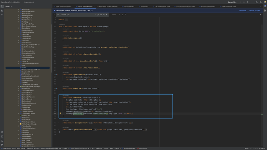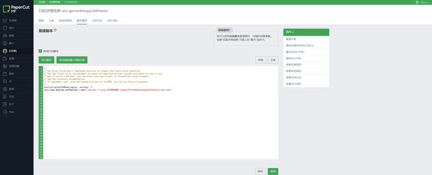 PaperCut MF NG 中 SetupCompleted接口中存在未授权访问漏洞,攻击者通过漏洞可以获取后台管理员权限,通过配置脚本JAVA扩展类,可以达到远程命令执行控制服务器