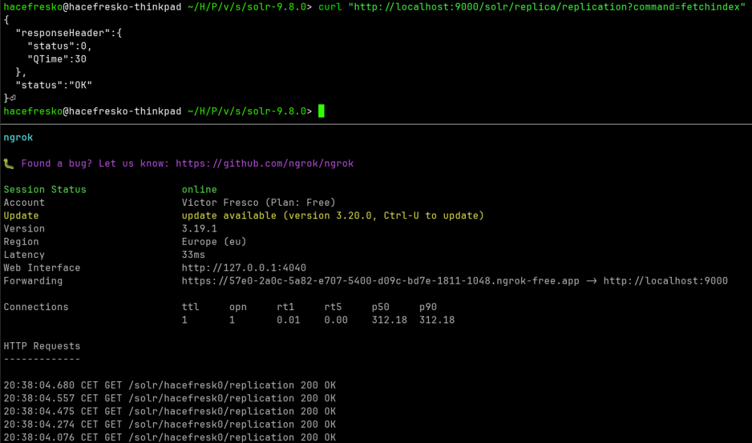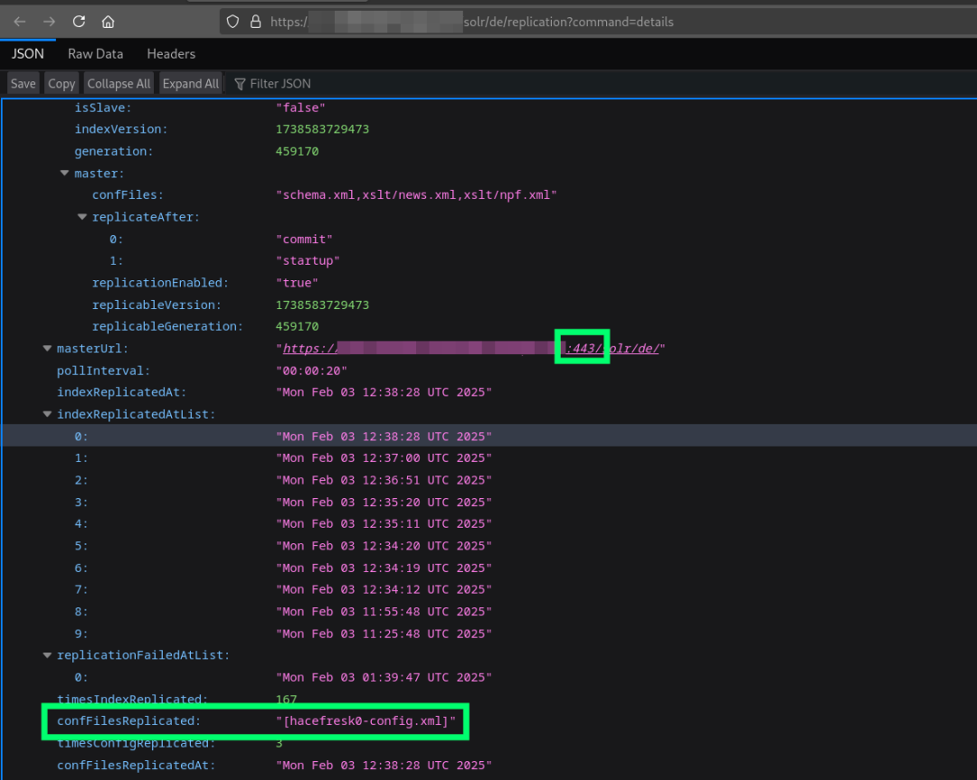 和之前一样,我重启了本地服务器,并在目标服务器上使用 “fetchindex” 命令触发了复制。我在 ngrok 接口上收到了多个请求,表明复制已成功执行。当我在目标服务器上执行 “details” 命令时,显示 “hacefresk0-config.xml” 已被正确复制,且 leader URL 现在包含了 “:443″,这意味着我成功修改了目标服务器的配置!