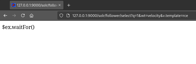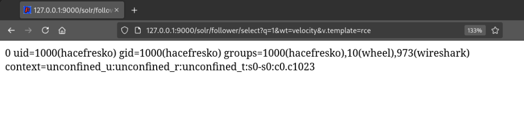 我用这些新的 Velocity 库替换了本地 Solr 实例中的旧库,其中 Velocity 已经在之前的测试中配置好了,然后再次尝试访问”/select?q=1&wt=velocity&v.template=rce”来渲染”rce.vm”模板: