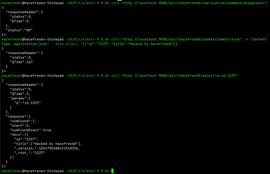 由于我的本地 Solr 实例 “hacefresk0” 已经包含了目标服务器的数据集,我将其复制请求处理器配置为 leader,为目标服务器提供恶意的 “solrconfig.xml” 文件和修改后的 Velocity .jar 库:
