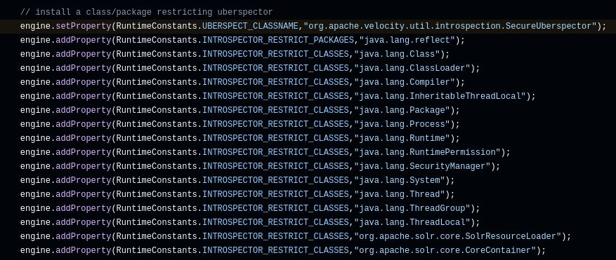 第一个结果对应的是在”solr-velocity/src/main/java/org/apache/solr/response/VelocityResponseWriter.java”中负责禁用新类实例化的代码片段!