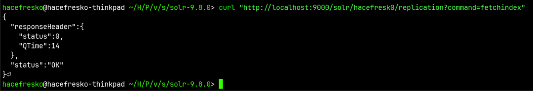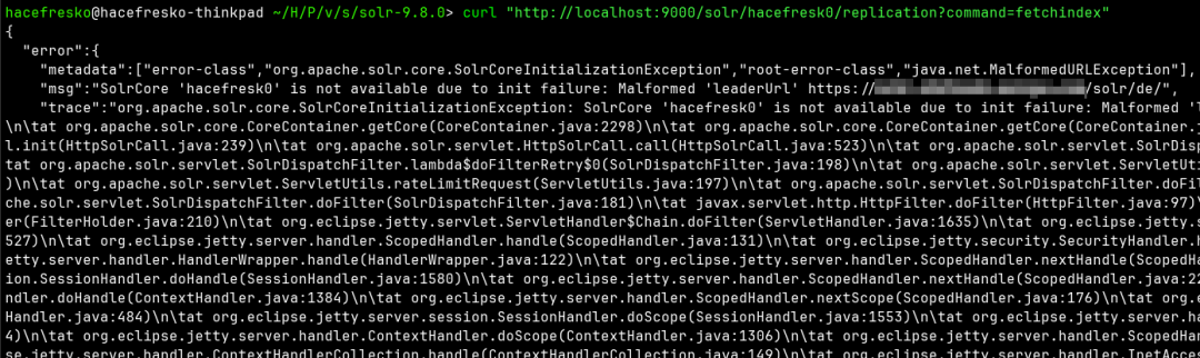 这意味着我发现盲 SSRF 漏洞的 Solr 服务器是一个 follower 实例,可以通过指定 leader 来使用 “fetchindex” 命令执行一次性复制。