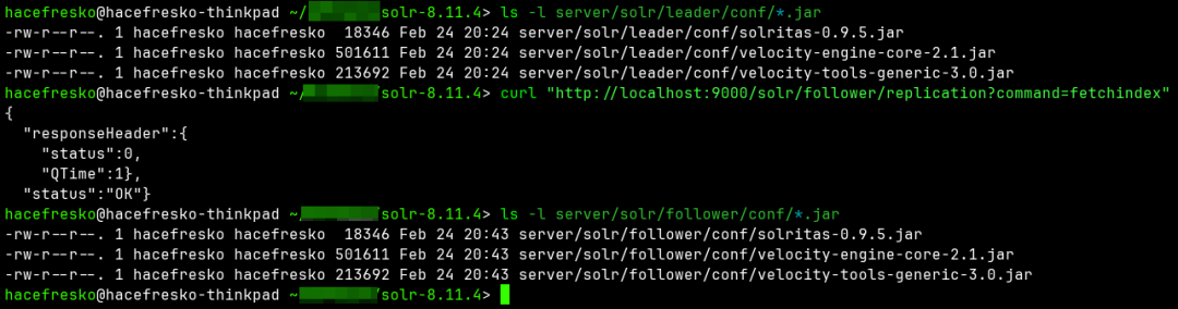 我启动了两个 Solr 实例:一个 leader 和一个 follower。我将 Velocity 的 .jar 文件复制到 leader 的 “solrconfig.xml” 所在目录(”server/solr/leader/conf/”)中,并配置它在复制时分发这些文件:
