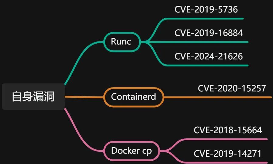 本篇章中将说明历史上有关容器逃逸的披露漏洞。个人才疏学浅,有未阐述清楚或遗漏的地方,还请谅解,相关的内容可自行搜索。