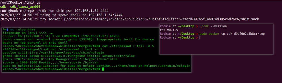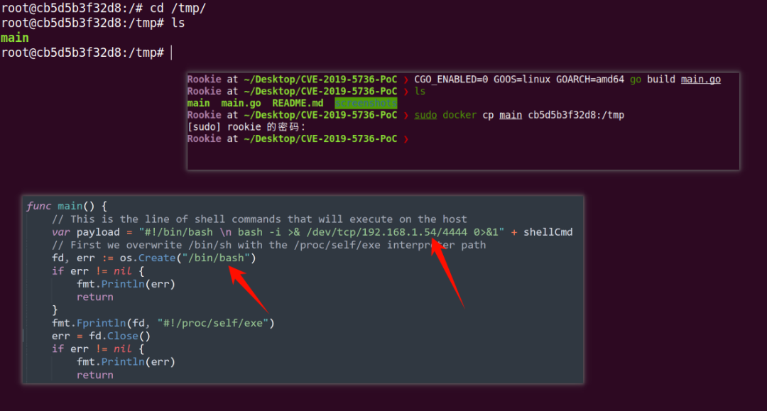 修改 Poc 中执行的命令并编译,将结果拷贝至容器中(这里只做复现,不关心如何拿到容器权限)。编译命令:CGO_ENABLED=0 GOOS=linux GOARCH=amd64 go build main.go
