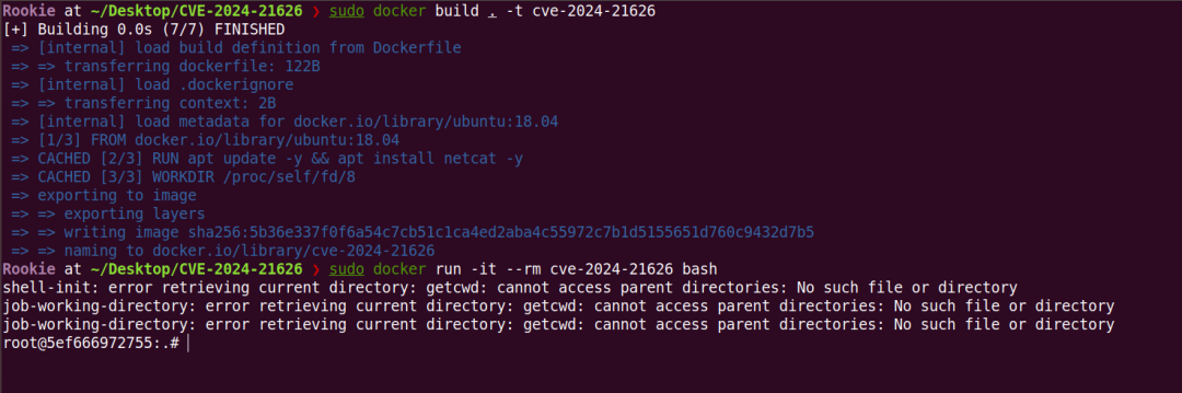 FROM ubuntu:18.04RUN apt update -y && apt install netcat -y# 注意如下的值,对应上述脚本执行的结果WORKDIR /proc/self/fd/8