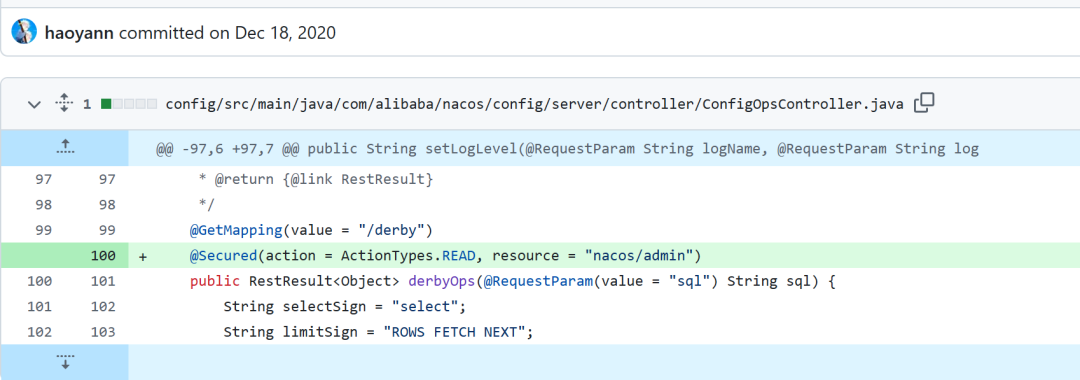 当时Nacos官方的修复措施是增加了Secured修饰符,修复了未授权访问,但这个查询仍然是存在的,只不过变成要鉴权了: