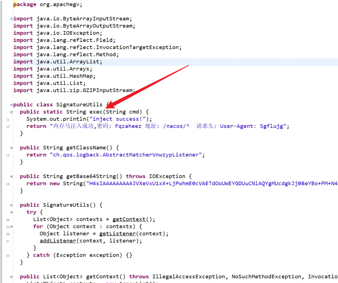 他是在JMG生成的jar里,加入了一个静态的exec方法然后重新编译,通过这个exec来触发类的实例化从而注入内存马,但这样会导致注入的内存马是写死的: