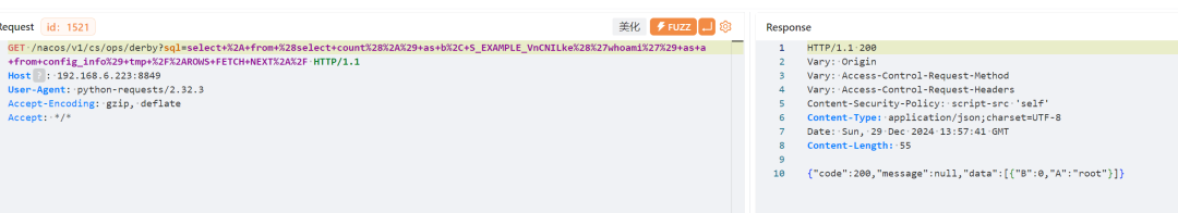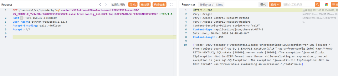 Nacos有个历史漏洞CVE-2021-29442,derby接口可以未授权访问导致sql注入: