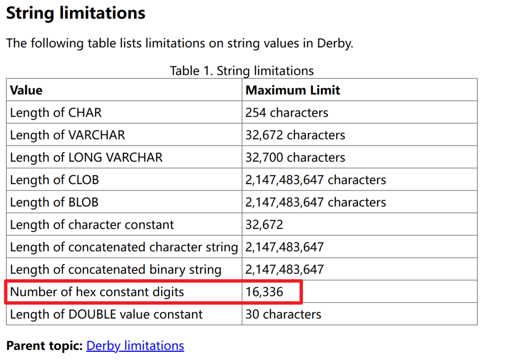 我查了下derby的官方文档,发现这里的大小限制是16336个字节: