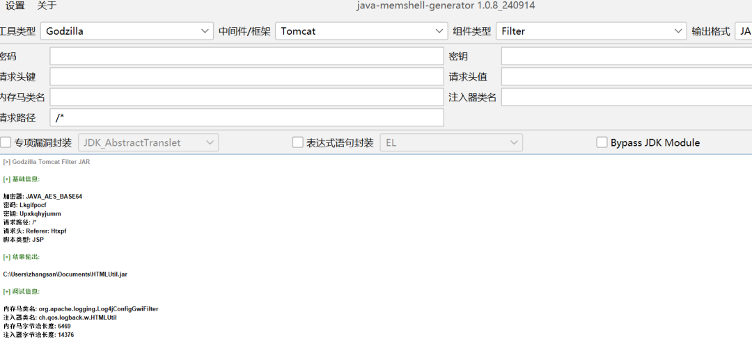 我们已经可以加载恶意jar并执行静态方法了,当加载类时会执行类里的静态代码,我们只需要在内存马注入器的静态代码里将类实例化就能做到注入内存马,而JMG生成的内存马默认就是这样。