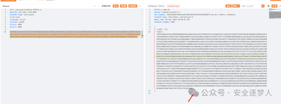 POST /u8cloud/hrmobile HTTP/1.1Host: 192.168.1.102:8087Content-Type: text/plainmcode:sssslanguage: zh_CNappcode: 12444pkcorp: 0001pkuser: 00014F96A911CD5C59F6A15C7E3ACD7968616A55957C0051D39786339CE1A2818670212BE1E9BEDDE8692B1211D74EAA8A79301485F94362ED1BABE47104695C7CD10D8CC66E97E8F5B0E3D25D41E8721E942E02ED95727D8B24A1352F9E9D979A8207D147A03A658DE2EE7696518F5262C8EA373A35F6AED7E0C71F9D0BBEA9B3BEB0F08C5FB05FE50D3FD4770CA7ECACABA7E8C79ACA76F922F8D7AFA0D304E0525E54332EFD559A1AF8E1381BFEA1E54B0625739B79E62049896E7C56D005DA15