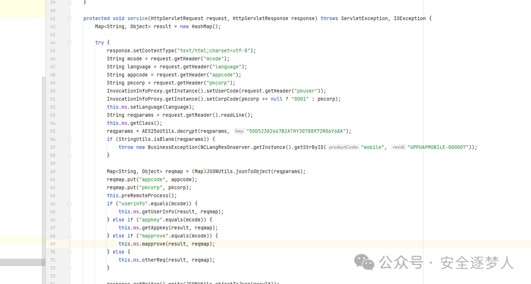 public voidmapprove(Map<String, Object> result, Map<String, Object> reqmap)throws Exception { IMobileServicesInvorkerservice= (IMobileServicesInvorker)NCLocator.getInstance().lookup(IMobileServicesInvorker.class); Listreslist= service.multiStrServicesInvorkerSP((List)reqmap.get("methodnames"), (List)reqmap.get("paramsClass"), (List)reqmap.get("params"), (List)null); Stringres= JSONUtils.objectToJson(reslist); res = AES256Utils.encrypt(res, "50D52382667B2ATHY30788972R06Y68A"); result.put("code", "0"); result.put("data", res); } publicvoidotherReq(Map<String, Object> result, Map<String, Object> reqmap)throws Exception { IMobileServicesInvorkerservice= (IMobileServicesInvorker)NCLocator.getInstance().lookup(IMobileServicesInvorker.class); Stringres= service.multiStrServicesInvorker2((List)reqmap.get("servicenames"), (List)reqmap.get("methodnames"), (List)reqmap.get("paramsClass"), (List)reqmap.get("params"), (List)null); res = AES256Utils.encrypt(res, "50D52382667B2ATHY30788972R06Y68A"); result.put("code", "0"); result.put("data", res); }