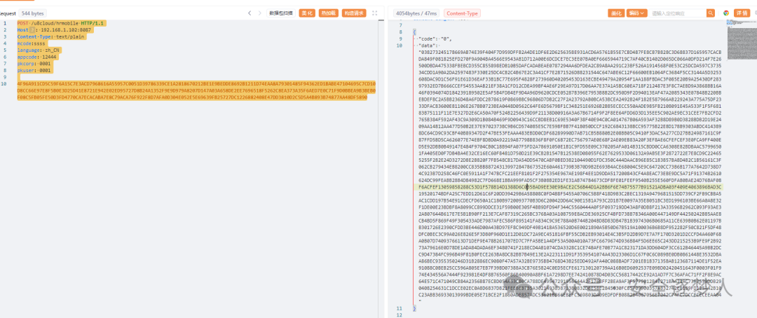 POST /u8cloud/hrmobile HTTP/1.1Host: 192.168.1.102:8087Content-Type: text/plainmcode:sssslanguage: zh_CNappcode: 12444pkcorp: 0001pkuser: 00014F96A911CD5C59F6A15C7E3ACD7968616A55957C0051D39786339CE1A2818670212BE1E9BEDDE8692B1211D74EAA8A79301485F94362ED1BABE47104695C7CD10D8CC66E97E8F5B0E3D25D41E8721E942E02ED95727D8B24A1352F9E9D979A8207D147A03A658DE2EE7696518F5262C8EA373A35F6AED7E0C71F9D0BBEA9B3BEB0F08C5FB05FE50D3FD4770CA7ECACABA7E8C79ACA76F922F8D7AFA0D304E052E5E69639FB25727DC1226882408E47DD3810D2C5D5A4B893B74877AA48DF5890