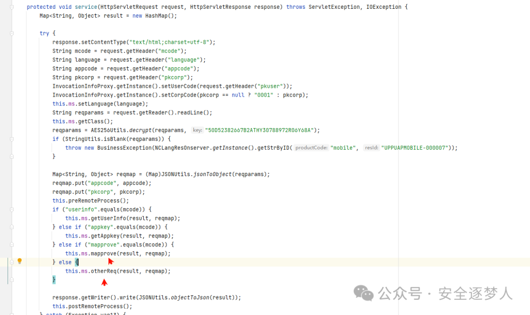 if ("userinfo".equals(mcode)) { this.ms.getUserInfo(result, reqmap); } else if ("appkey".equals(mcode)) { this.ms.getAppkey(result, reqmap); } else if ("mapprove".equals(mcode)) { this.ms.mapprove(result, reqmap); } else { this.ms.otherReq(result, reqmap); }