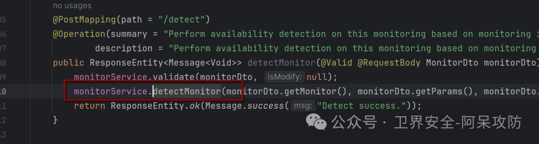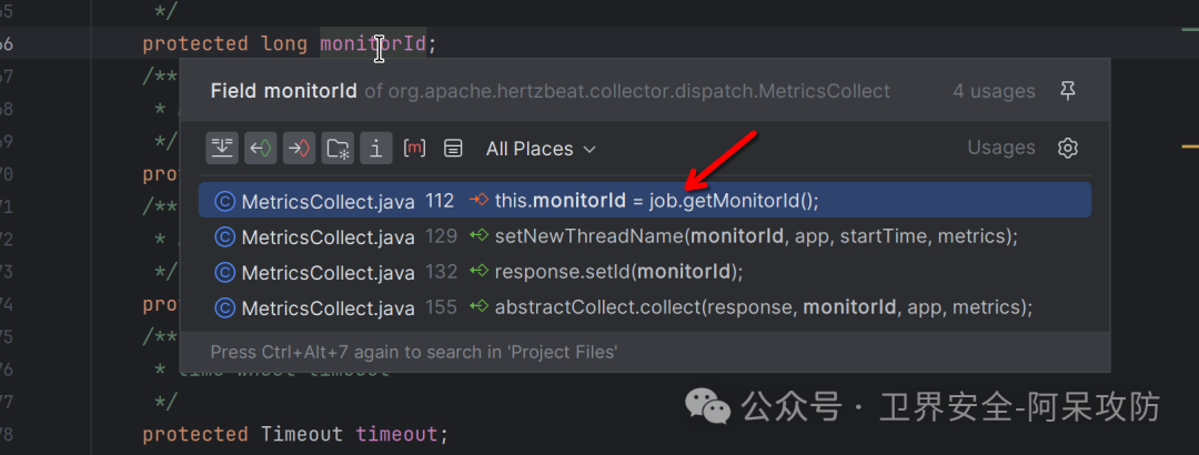 中,在这里,调用链的第一部分结束,程序运行时的最后一段结束,接下来我们就要跟踪该类中的字段了,通过查看字段定义,我们继续跟踪到monitorId