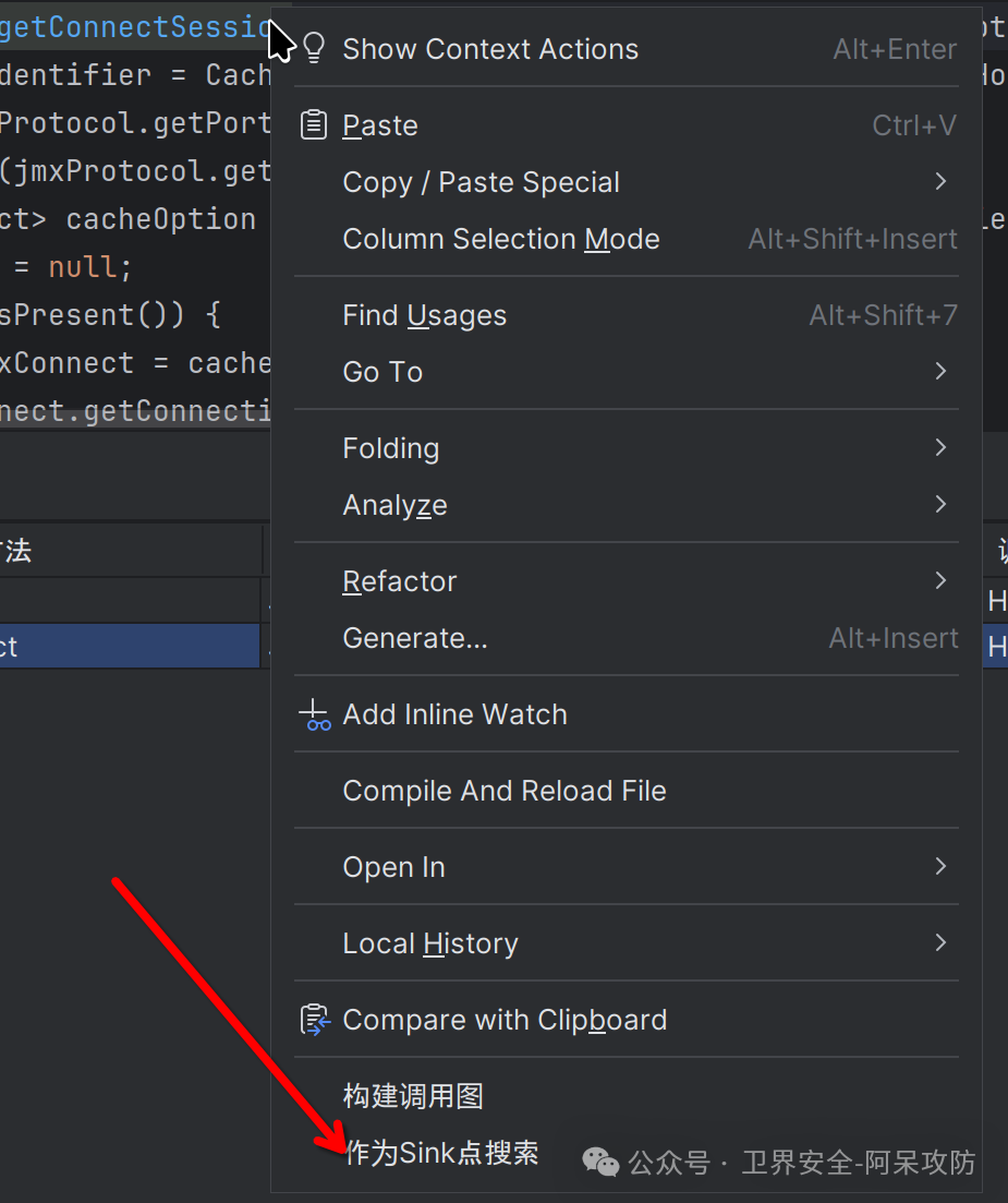 接下来我们右键点击该方法后,选择作为 Sink 点搜索