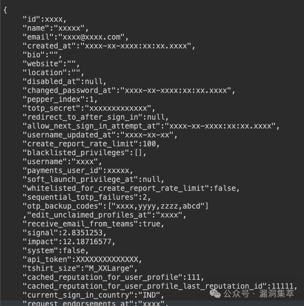 对象中大量敏感字段(邮箱、OTP 备份码、GraphQL token 等等)。