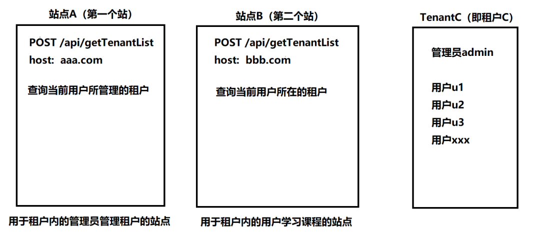 对一个站来说,只有租户C的管理员admin来到第一个站,调用该接口,才会查询到租户C,而用户u1,u2等,来到站点A时,由于不是租户C的管理员,所以是无法查询到租户C的;