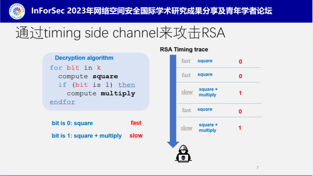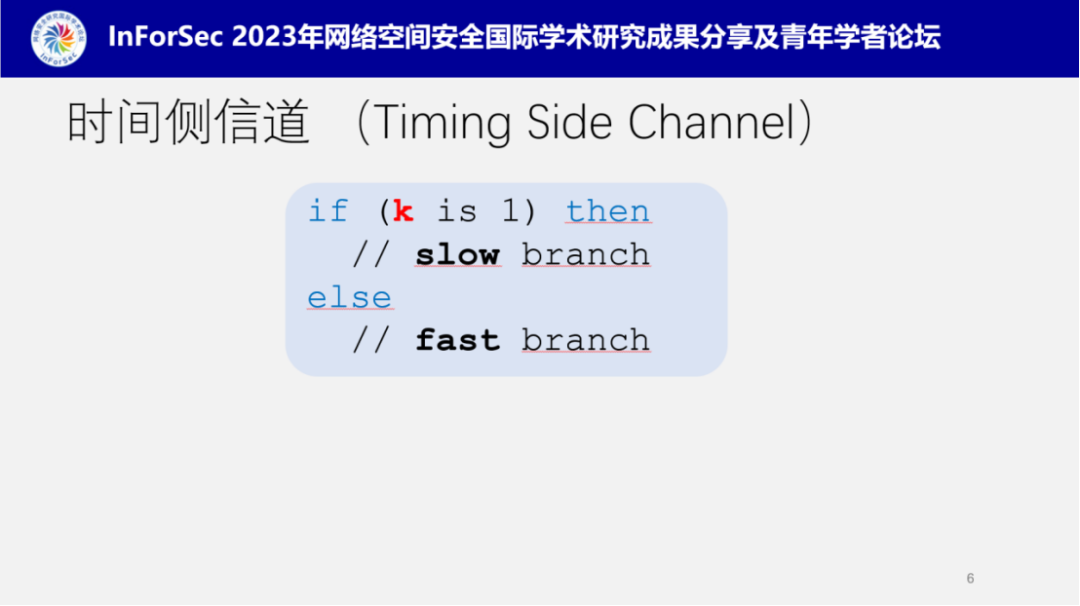 侧信道攻击,如下图的抽象代码所示,当k为1时,进入一个执行比较慢的分支,其他值时则进入一个执行比较快的分支,那么通过观察程序的执行时间时可以推测出k的值是否为1。这个例子看起来很简单,但这种方法可以非常有效的用于攻击RSA加密算法。