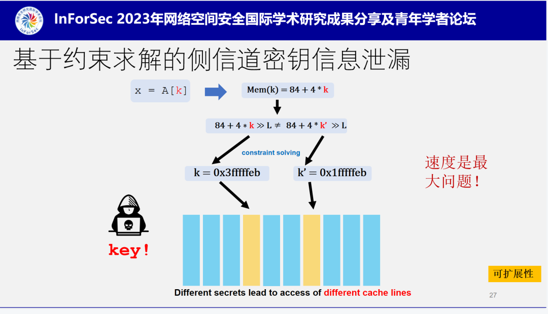 侧信道密钥信息泄漏,它的主要思想是对密钥相关的程序行为进行形式化的表征,然后再进行约束求解,如果可解,则代表能够得到攻击结果,这种方法是比较直观的,但是存在一个很大的问题就是速度问题,实际执行起来会非常的慢。