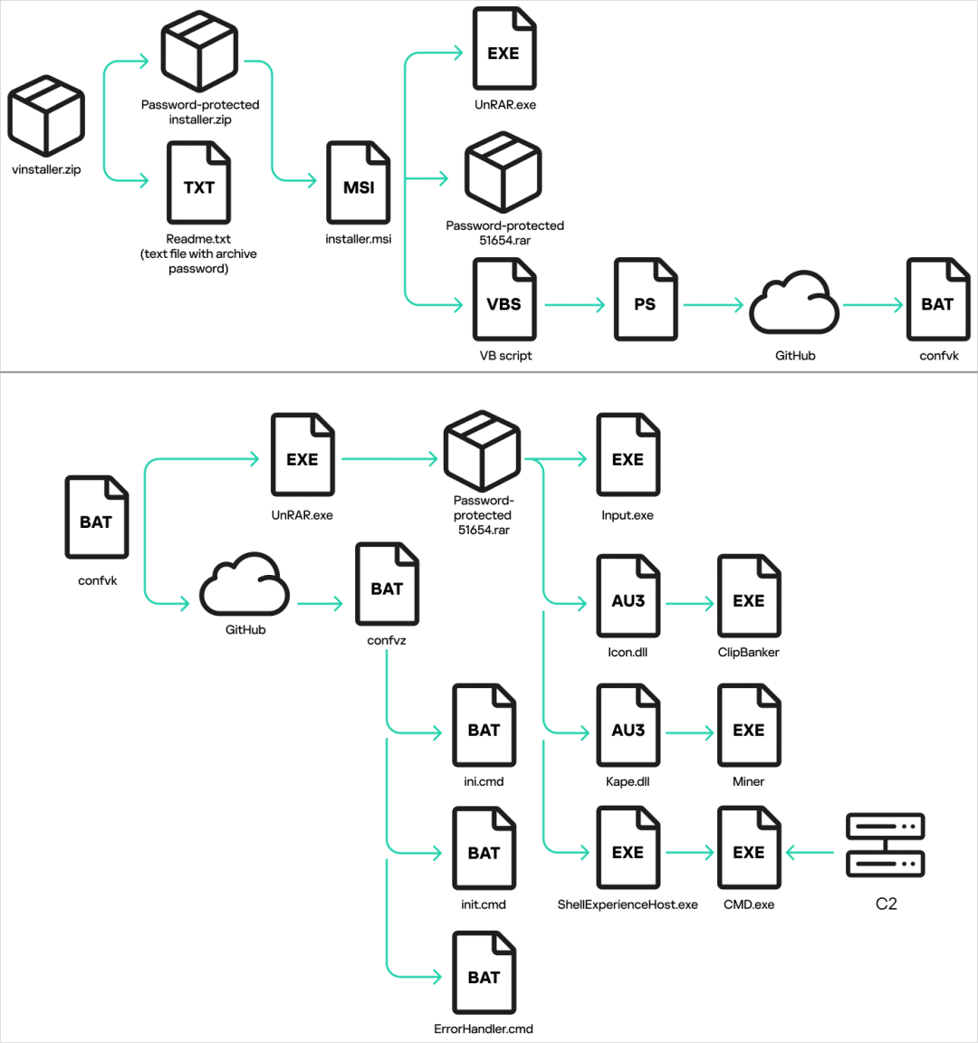 该归档文件包含一个MSI文件(installer.msi),其大小膨胀到700MB,以逃避AV扫描。运行它会删除‘UnRAR.exe’和‘51654.rar ’,并执行一个Visual Basic脚本,从GitHub获取批处理脚本(confvk.bat)。