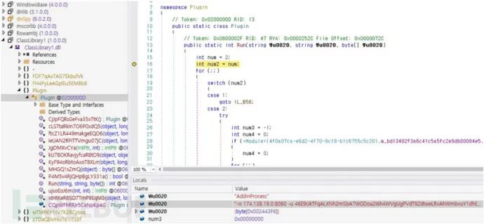 plugin_4.dll 是一种经过编码的 .NET 恶意软件,其主要功能是解码 plugin_3.dll 文件。释放矿机,并将 plugin_3.dll 注入指定的良性进程 AddInProcess.exe。