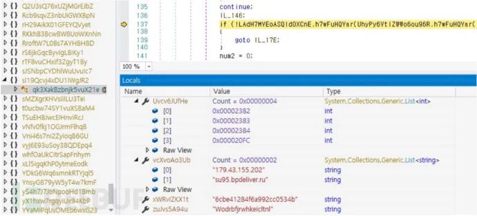 在 RegAsm.exe 进程中注入并执行的恶意软件经过混淆处理,但与 Fortinet 研究ScrubCrypt 的相似性来看,很可能是 ScrubCrypt 类型的恶意软件。用于攻击的 ScrubCrypt 中包含 3 个 C&C 的 URL 与 4 个端口(58001、58002、58003 和 58004)。
