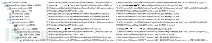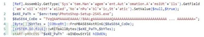 脚本首先绕过 AMSI,随后在 %TEMP%PhotoShop-Setup-2545.exe 路径中创建并执行内嵌的恶意软件。PhotoShop-Setup-2545.exe 是由 .NET 开发的 Downloader 类恶意软件,会下载恶意代码并将其注入 RegAsm.exe。