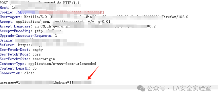 这里是让我们提供身份证号和手机号才能进行重置,假设我们这里已经通过信息收集获取到了这个人员的身份证号和手机号,我们点击获取验证码后进行抓包,将手机号改为自己的手机号