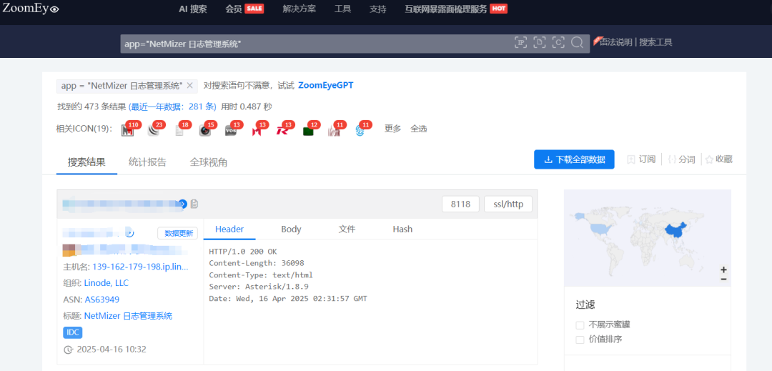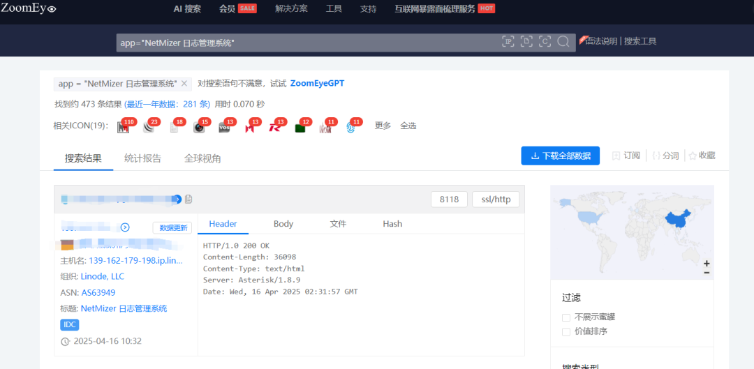 根据ZoomEye网络空间搜索引擎关键字 app=”NetMizer 日志管理系统” 对潜在可能目标进行搜索,共得到473条IP历史记录。主要分布在中国、美国等国家。