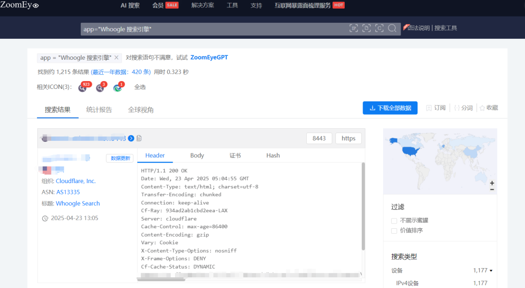 根据ZoomEye网络空间搜索引擎关键字 app=”Whoogle 搜索引擎” 对潜在可能目标进行搜索,共得到1215条IP历史记录。主要分布在美国、德国等国家。