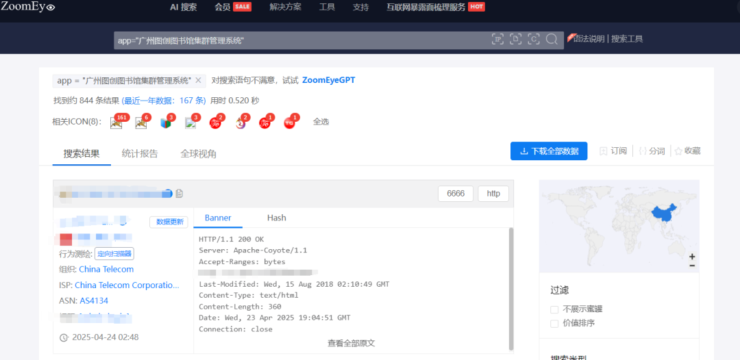 根据ZoomEye网络空间搜索引擎关键字 app=”广州图创图书馆集群管理系统” 对潜在可能目标进行搜索,共得到844条IP历史记录。主要分布在中国山东、上海等地。