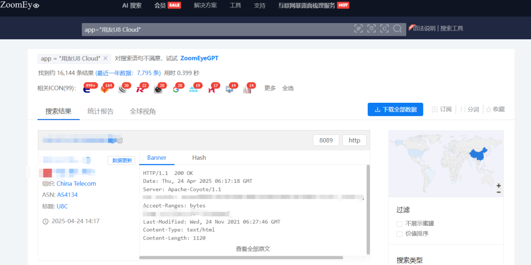 根据ZoomEye网络空间搜索引擎关键字 app=”用友U8 Cloud” 对潜在可能目标进行搜索,共得到16144条IP历史记录。主要分布在中国、美国等国家。