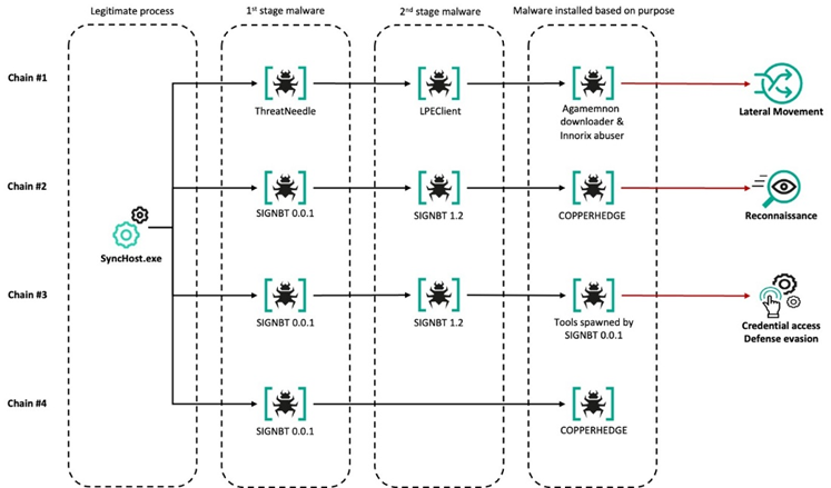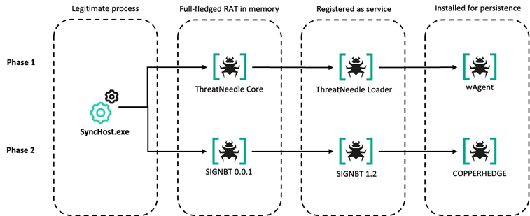 我们根据所使用的恶意软件将此作分为两个阶段。第一阶段主要关注涉及 ThreatNeedle 和 wAgent 的执行链。然后是第二阶段,涉及使用 SIGNBT 和 COPPERHEDGE。