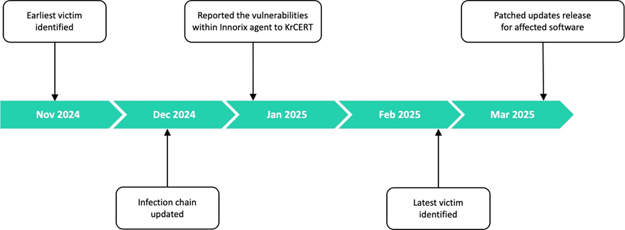 由于 Innorix 滥用者的潜在危险影响,我们向 KrCERT 报告了此漏洞,但被告知该漏洞过去曾被利用和报告过。我们已确认,此恶意软件在使用 9.2.18.496 以外的 Innorix Agent 版本的环境中无法有效运行。