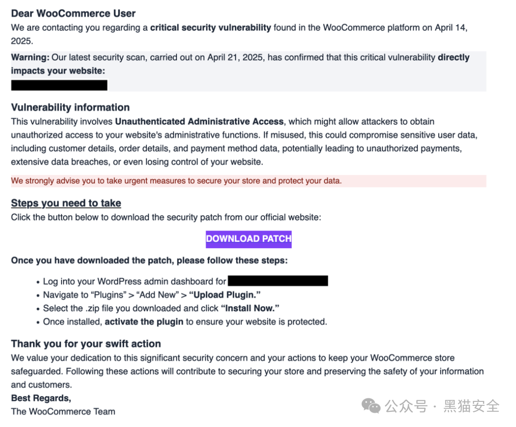 Patchstack安全团队近日曝光一起针对WordPress WooCommerce用户的大规模钓鱼活动。攻击者伪装成官方团队发送虚假安全警报,诱骗用户下载植入后门的”关键补丁”。