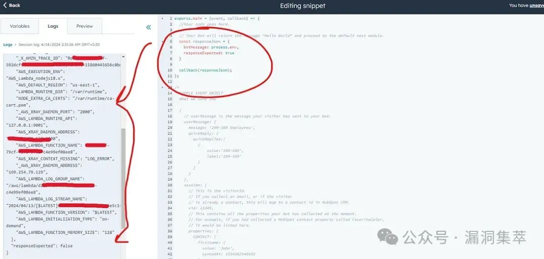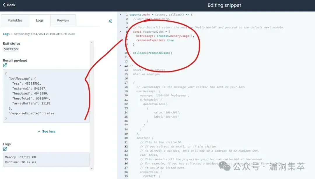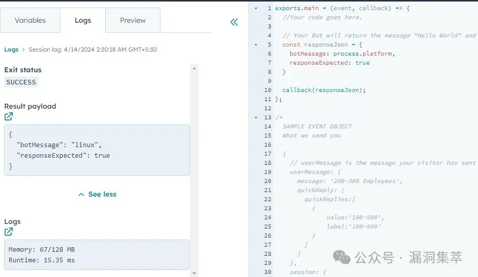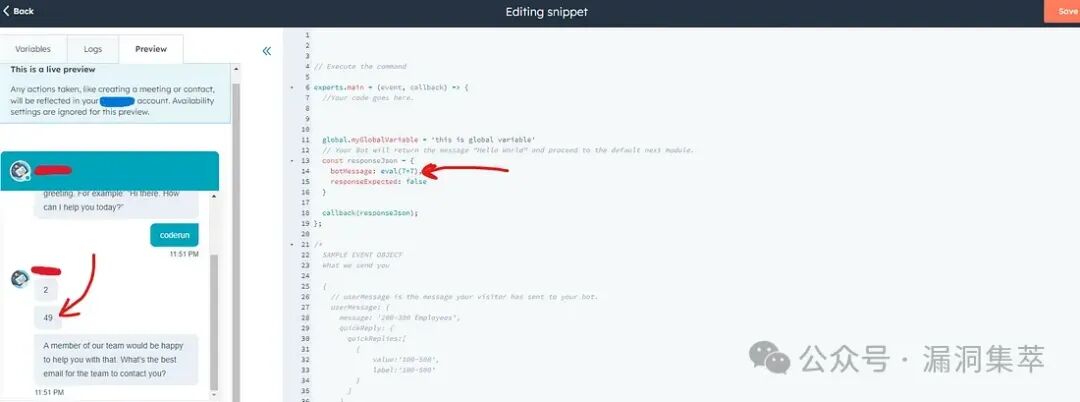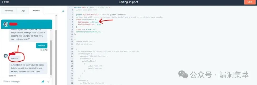 “运行代码片段”允许开发者编写自定义代码,以生成聊天机器人的特定响应。默认代码片段如下: