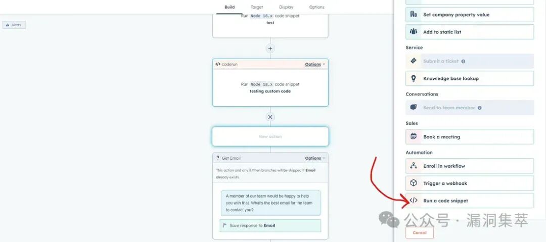 “从零开始”提供了一系列定制化选项,包括工作流、Webhooks以及自定义代码片段等。这些功能为开发者提供了极大的灵活性,但也让我嗅到了一丝潜在的安全隐患。尤其是“运行代码片段(Run a Code Snippet)”这一选项,看起来像是一个可以深入挖掘的突破口。