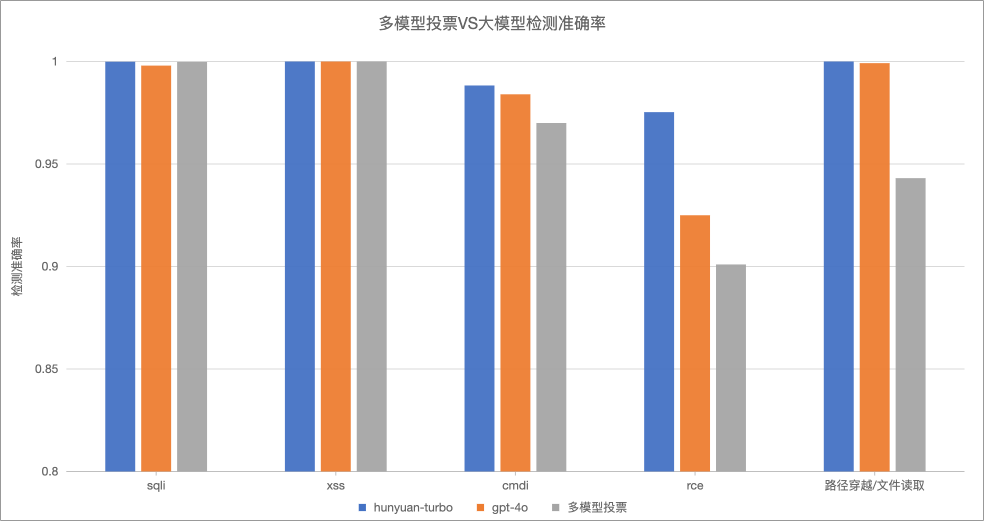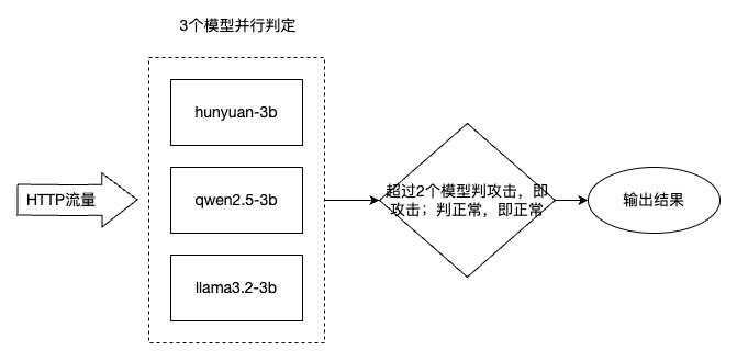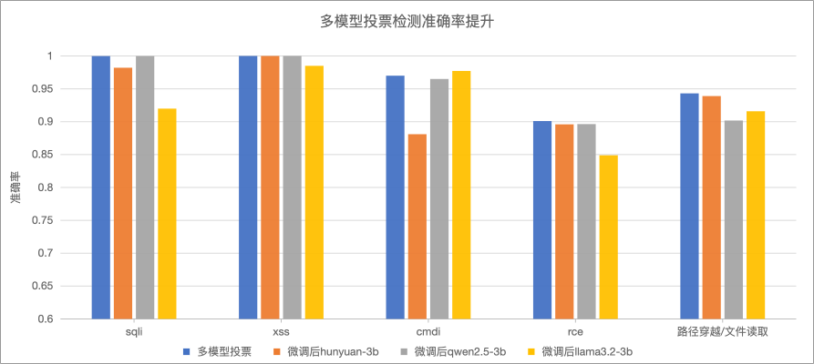 这里同时进行了多个基座小模型的微调,包括hunyuan-3b,qwen2.5-3b,llama3.2-3b小参数模型,在测试样本集攻击检出率和白样本识别率方面,各有优劣,通过分析差异样本,腾讯混元模型在5个攻击类型场景中的3个表现较优,2个可以和其他模型互补,进一步设计3个小模型联合投票检测方案,以提升整体检测准确率。