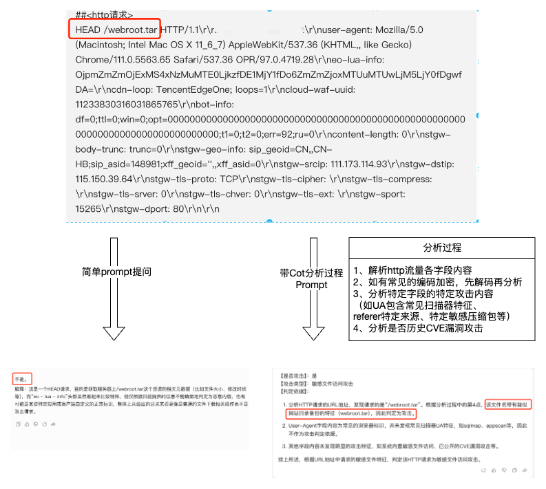 在prompt调优过程中,借鉴CoT思维链思路,根据现网攻击流量特征,给出判定一个请求是否是Web攻击的分析过程,引导大模型按照步骤逐步分析,最终确认结果,就像福尔摩斯通过案件细节一步步推理得到最终真相!