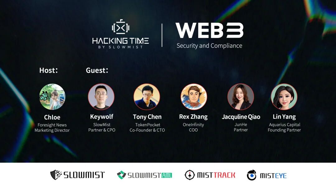 论坛近半时,现场进行了一场干货满满的圆桌讨论。圆桌由 Foresight News 的 Marketing Director Chloe 主持,邀请了 5 位来自不同领域的专家参与对话:慢雾(SlowMist) 合伙人 & CPO Keywolf,TokenPocket Co-Founder & CTO Tony Chen,Onelnfinity 的 COO Rex Zhang,君合律师事务所的合伙人 Jacquline Qiao,以及来自 Aquarius Capital 的 Founding Partner Lin Yang。