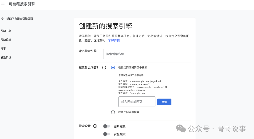 通过Google的可编程搜索引擎,我们可以轻松创建一个仅显示你指定网站的搜索字段,如果你是第一次使用该工具,你会看到如下图所示的页面:
