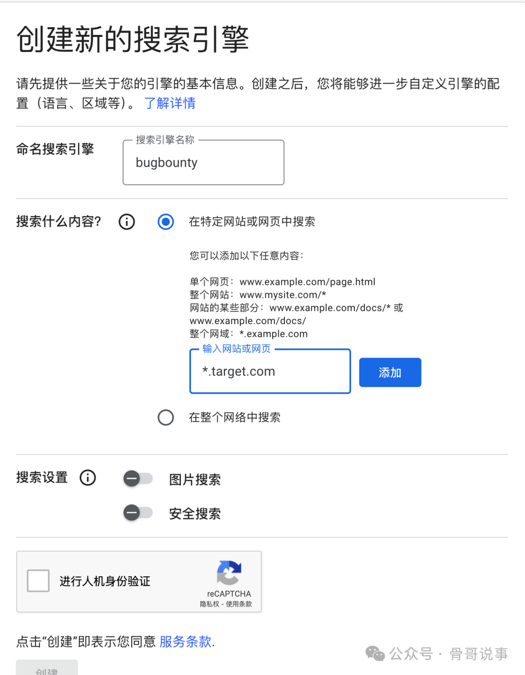 “搜索设置”里,我们无需开启“图片搜索”和”安全搜索“,然后通过”人机身份验证“后,就可以点击最下方的”创建“按钮了: