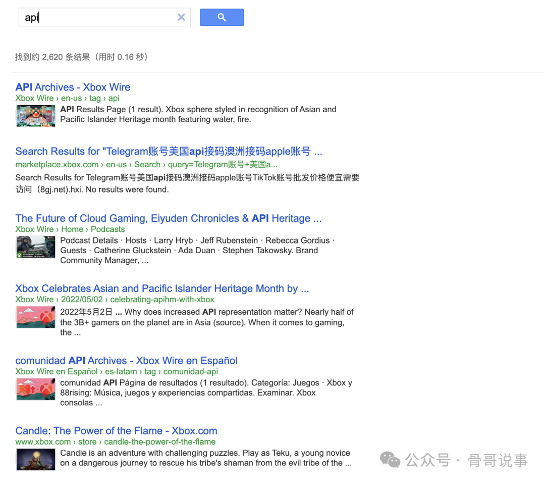 假设你需要寻找 API 端点,就可以只输入“api“,来方便的搜索指定目标网站的 API 端点的有关信息: